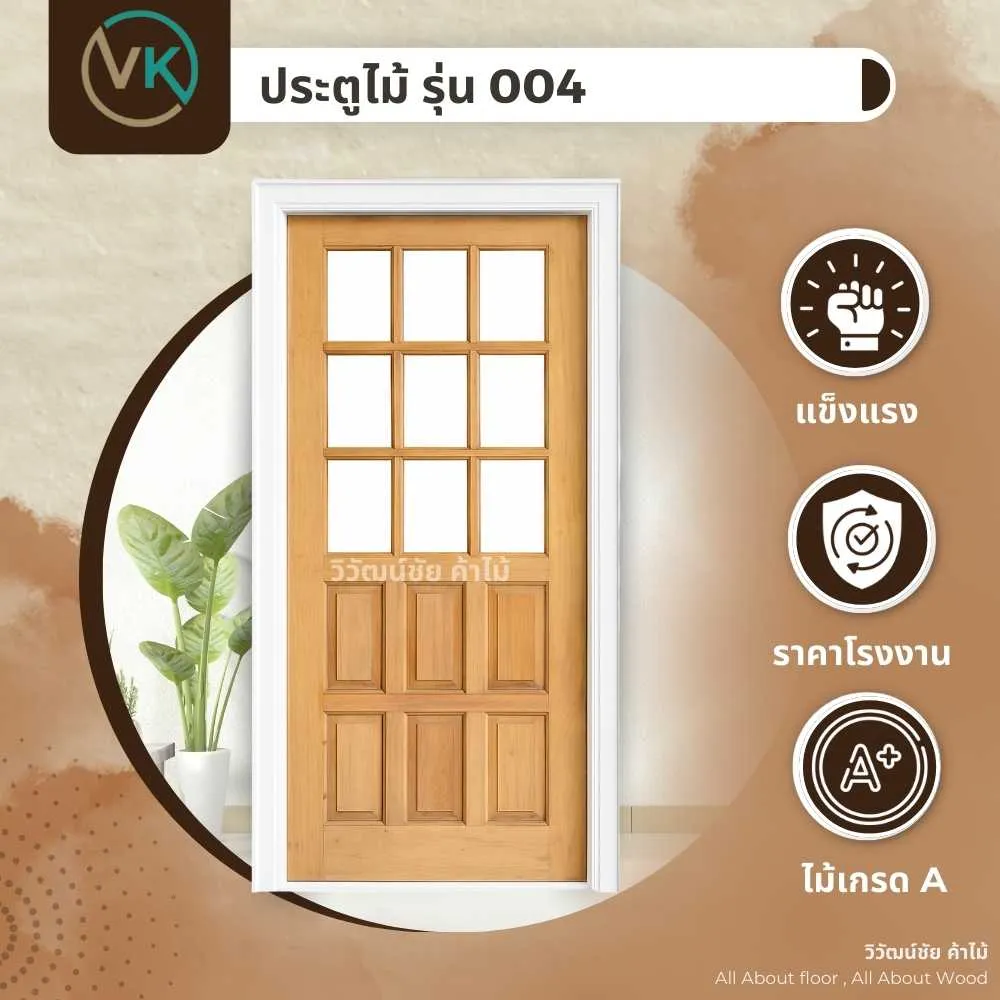 ประตูไม้ รุ่น 004 จากแบรนด์ VK Wood คือประตูไม้จริงดีไซน์หรู ที่ผสมผสานความลงตัวระหว่าง ความโปร่งสว่าง และ ความแข็งแรงทนทาน ด้วยการออกแบบที่แบ่งครึ่งบนของบานเป็น กระจกใส 9 ช่องแบบตาราง ช่วยให้แสงธรรมชาติเข้าสู่ภายในบ้านได้อย่างสวยงาม ส่วนครึ่งล่างเป็น ลูกฟักไม้ 6 ช่องแนวตั้ง ซึ่งให้ความรู้สึกมั่นคง คลาสสิก และกลมกลืน