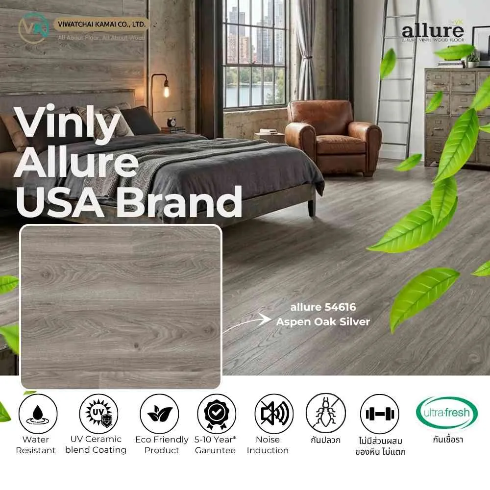 พื้นไวนิล Allure – Engineer Vinyl Plank – รหัส 54616 DL ขนาด 190 x 1210 x 5 mm. พื้นไม้ไวนิลบริสุทธิ์จากประเทศอเมริกา ทนต่อ ปลวก และ ความชื้น เกรด E1 ปลอดภัยต่อสุขภาพ