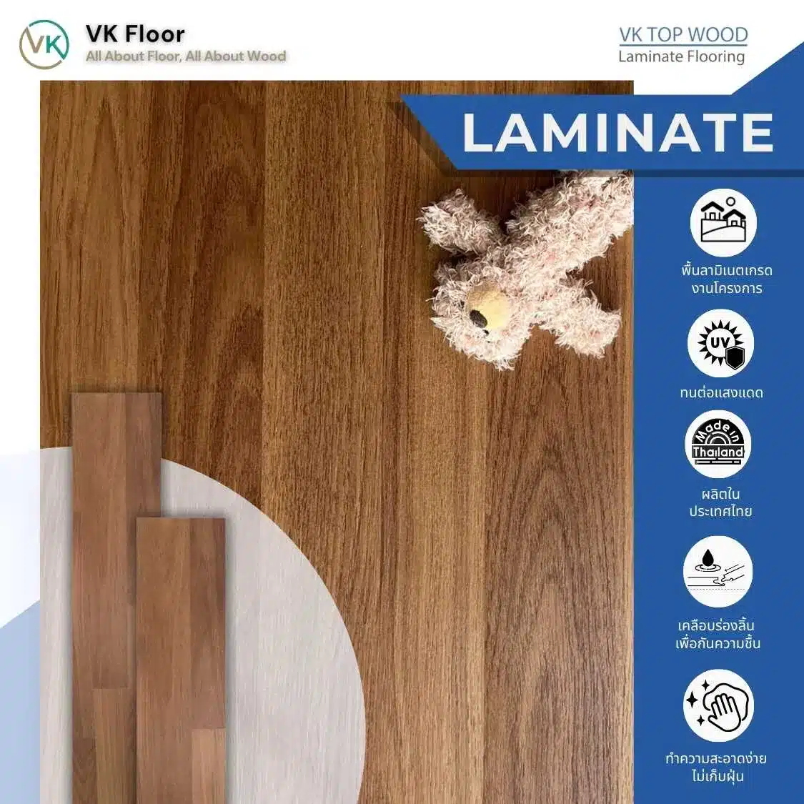 พื้นลามิเนตรุ่น VK Top Wood เป็นพื้นไม้ลามิเนตคุณภาพสูง ที่ผลิตในประเทศไทย โดยได้รับการออกแบบและพัฒนามาเพื่อตอบโจทย์การใช้งานในหลากหลายรูปแบบ ตั้งแต่งานโครงการขนาดใหญ่ งานตกแต่งภายในบ้าน และพื้นที่สาธารณะที่ต้องการความทนทานเป็นพิเศษ ด้วยเทคโนโลยีการผลิตที่ทันสมัยและการควบคุมคุณภาพอย่างเข้มงวด พื้นไม้ลามิเนตรุ่นนี้จึงสามารถตอบสนองความต้องการทั้งในด้านความสวยงามและความแข็งแรงได้อย่างลงตัว
